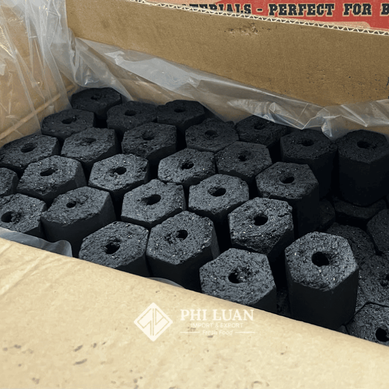 Coconut shell charcoal briquettes in cube, hexagon, and cylinder shapes are eco-friendly, high-density fuel blocks made from coconut shells, offering long burning time, high heat, and low smoke.
